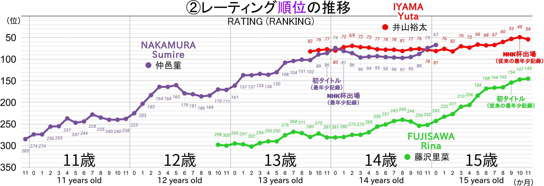 加えて、井山三冠との成長速度の比較につきましても、実際には仲邑三段のほうが大幅にレーティングの成長が早いものと考えられます。